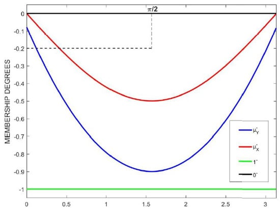 ([]). Let U be a non-empty set. A bipolar fuzzy set A on U is an object having the form where and are mappings. The positive membership degree represents the satisfaction degree of an element u with respect to the property associated with a bipolar-valued fuzzy set A, while the negative membership degree indicates the satisfaction degree of u with an implicit counter property of bipolar-valued fuzzy set A.