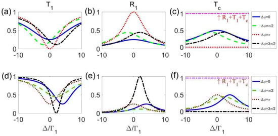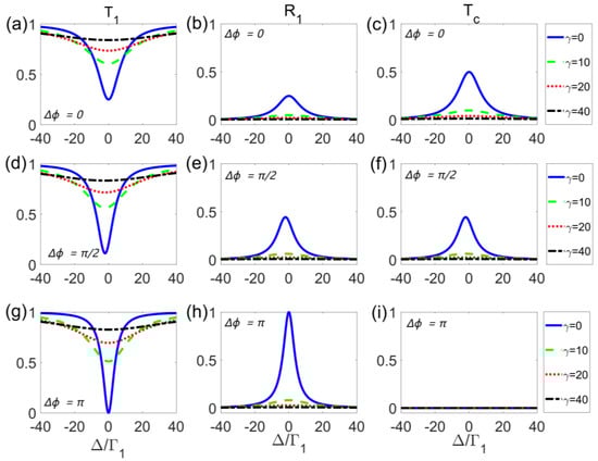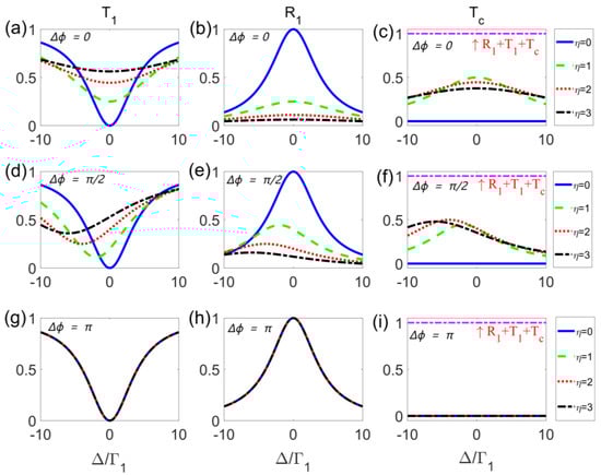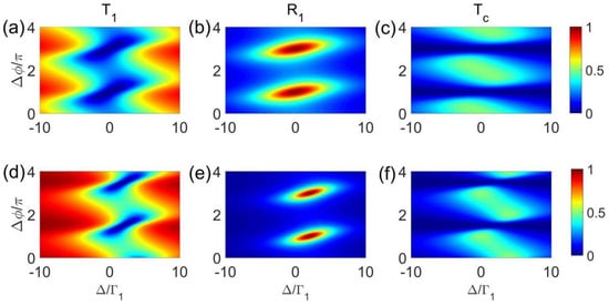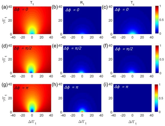In fact, the optimal frequency conversion () occurs at and when and . This phenomenon shows that when there is no atomic dissipation in the system, the system can achieve the optimal transmission rate of photons, which is 0.25. With an increase in dissipation, the number of transmitted photons decreases. When and , if there is no dissipation, the incident photon can be completely reflected and the photon cannot pass through the system.