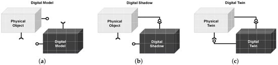 Subcategories of digital twins by their level of integration with the physical twins (Source: []) (a) The digital model is not connected to the physical object; (b) the physical object sends data and changes to the digital shadow automatically; (c) all changes in the digital twin are sent automatically back to the physical twin.