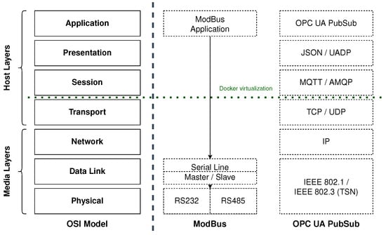 Within this context, the physical object plays a crucial role as the source for the digital shadow, an essential and integrated component of the digital twin. This is notably exemplified in HIL workflows, where engineers still connect a physical object to software running in their integrated development environment (IDE), e.g., VSCode, to validate the incoming data and probably develop new functions based on that. However, this approach is not without its limitations, often leading to constrained access and inconveniences, particularly when multiple engineers are involved. Even with the use of asynchronous collaboration tools, the challenge of collaborative work on embedded software systems remains, as engineers persistently require direct access to the hardware. One of the reasons for the persistent need for a connection to real hardware can be elucidated through the open systems interconnection (OSI) model; see Figure 2. The embedded community extensively relies on various industrial interfaces and communication protocols, encompassing ModBus, OpenCAN, OPC-UA, or MQTT, among others. Notably, hardware interfaces like RS232/RS485, utilized by ModBus, establish direct access from the application layer to the data link/physical layer. This stands in contrast to network protocol-based interfaces like OPC-UA. Over time, various protocols have undergone significant evolution. For example, ModBus features two protocol standards: one for serial line [] and another for TCP/IP over Ethernet []. Similarly, OPC, initially a server/client protocol, adopted a subscription model based on the Observer pattern with Version 1.04, and subsequently integrated a full publish/scrube mechanism using MQTT into the standard with Version 1.05 []. This distinction underscores the ongoing necessity for direct hardware access in specific scenarios.