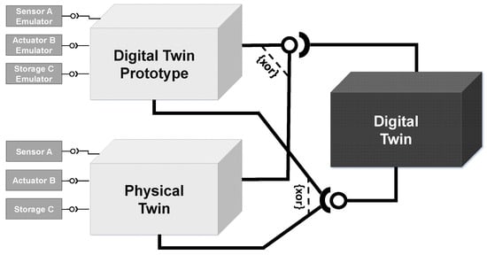 The relationships among a physical twin, digital twin, and digital twin prototype in our approach are illustrated in Figure 3. The digital twin prototype closely mirrors the software configuration of its corresponding physical twin but utilizes emulated sensors/actuators in place of real ones. The digital twin may share certain software logic components with the physical twin, albeit without connected sensors and actuators. Additionally, it could incorporate additional logic for managing both the physical twin and the digital twin prototype. This approach seamlessly integrates all interfaces into the development process, ensuring that the inputs and outputs of the emulated hardware align with those of the real hardware. The emulators respond to the same commands and generate data packets in formats identical to their real counterparts. Consequently, the digital twin prototype serves as a reliable source for creating a digital shadow. In other words, it acts as a prototype of the physical twin and can effectively substitute it during the development phase or for automated testing of the embedded software system.