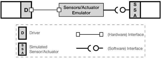 Figure 4 illustrates the fundamental concept of a digital twin prototype setup with interfaces. A device driver associated with a physical object employs a virtual hardware interface to establish a connection with an emulated sensor/actuator. These emulated sensors/actuators may utilize recorded data, such as data acquired during real deployments, to provide virtual context. Alternatively, if real data are unavailable, a simulation is employed.