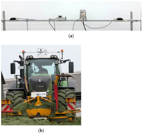 Sensor bar which monitors the process of silage making []. (a) Sensor bar in lab environment; (b) Sensor bar mounted on a tractor.