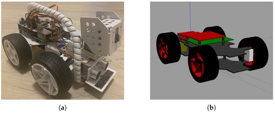 Figure 8a displays the PiCar-X, which is powered by two direct current (DC) geared motors, one for each rear wheel, and features two front wheels steered by a servo motor. As we did not find any CAD model of a PiCar-X, we used, for simulation purposes, a PiCar-V model in a Gazebo [] simulation, as shown in Figure 8b. Despite using the PiCar-V CAD model, its proportions, including wheelbase and track width, are identical.