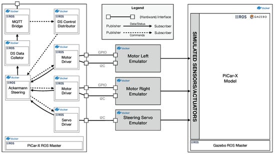 The simulation employs the “ros_control” package to simulate sensors and actuators, with all emulators connected to the Gazebo ROS Master. The primary interfaces are general-purpose input/output (GPIO) pins and an inter-integrated circuit (I2C), as seen in the middle of Figure 9. Both can be emulated using tools from the Linux kernel. The virtual GPIO interaction module (gpio-mockup) and the I2C chip (I2C-stub) must be imported into the container. The DC motors utilize GPIO pins to control forward or backward movement, while the speed of the DC motors and the angle of the servo motor are set through an I2C interface. The Ackermann steering [] node waits for incoming commands to drive and subsequently publishes messages with speed values to the motor drivers and an angle message to the servo driver. The emulators read these values from the I2C chip and publish corresponding commands to the simulated actuators via ROS messages. For the DC motor emulators, the value of the GPIO pin determines whether the published value is positive (for forward movement) or negative (for backward movement).