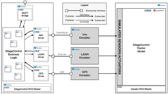 To transition from a physical twin to a digital twin prototype for development and testing purposes, the subsequent step involved linking the device drivers to emulators connected to the simulation, as illustrated in Figure 11. These emulators received commands from the device drivers through different interfaces (Ethernet, RS232, and USB) and relayed these commands to the GAZEBO simulation. Subsequently, the simulated sensors in GAZEBO reacted to the transmitted commands, producing simulated data that were then sent back to the emulator. Finally, the emulator forwarded these data to the corresponding device driver for further processing.