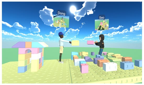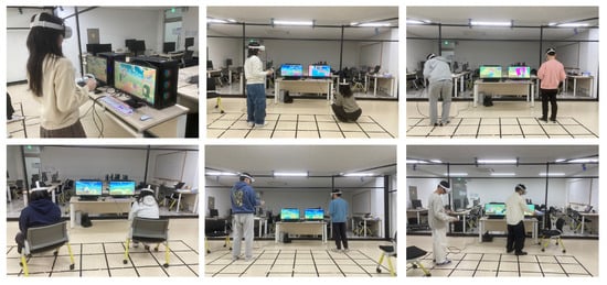 The VR system used for the experiment was implemented on a system with specifications including a Ryzen5 5700×, 32 GB of memory, RTX3070, and Windows 10. The Meta Quest 2 was connected via wire to access the virtual environment. The network system was implemented using the Photon Fusion engine, and VR connectivity was achieved through the XR Interaction Toolkit. The functionality of transferring the movements of a user wearing VR equipment directly to an avatar was implemented using Rootmotion’s VRIK tool. Our experiment took place in a dedicated space free from external disturbances, with wired Internet connectivity to PC, and VR equipment of identical specifications provided to the participants. Each participant conducted the experiment within a confined space of 1.5 m × 1.5 m. Please refer to Figure 3.