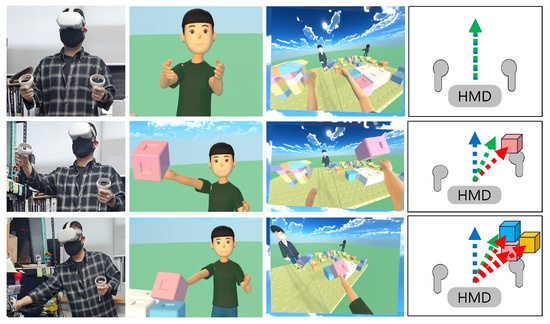 The virtual camera is fixed at the user’s head position, but its direction is dynamically changed in response to the user’s movements and actions, allowing the camera to actively share a varying perspective. The elements to which the camera responds are divided into three categories: The first is the direction for forward (), representing the user’s frontal gaze direction. The second is the direction for interaction (), indicating the direction between the camera and the object with which the user interacts using the motion controller. Lastly, the direction for the surroundings () is an element representing the direction between the camera and the nearby objects within a certain range around the object the user is interacting with.