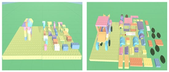 Participants formed pairs and entered the virtual environment. On the left side of this virtual environment, a completed block assembly served as a sample (target), while on the right side, the blocks used in the sample were laid out on the ground (source) (see Figure 4). The objective of each task was for participants to use the source blocks to complete the target assembly. In the first experiment, Task 1, as shown on the left in Figure 4, participants initially created a house located on the left. In the second experiment, Task 2, they created a truck located on the right in Figure 4. Half of the experimental groups had the condition ‘with view sharing’ in Task 1 and ‘without view sharing’ in Task 2, while the other half had the opposite condition, ‘without view sharing’ in Task 1 and ‘with view sharing’ in Task 2. There were no constraints on the assembly sequence or methods other than this.