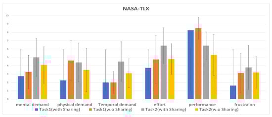 - Mental demand: “How mentally demanding was performing the given task through this system?” Responses from participants indicated that, in Task 1, the mental demand was slightly lower when the perspective was shared, while in Task 2, a better evaluation was given when the perspective was not shared.