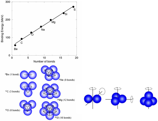 Figure 2. This illustrated how the binding energies could be understood in terms of the number of interactions between α-particles and an α–α interaction energy. This invites a view of these nuclei in which the α-particle structure plays a significant role and that the momentum correlations associated with the nucleon–nucleon interaction, in turn, induces spatial arrangements of the α-particles. The other important feature of the α-particle is the very high energy of the first excited state, which lies at ~20 MeV. Compared with other nuclei, this is very high and attests to the strength of the correlations and the inertness of the α-particle. As such, once formed within the nuclear environment, one can expect the α-particle to have a significant lifetime. The structures shown in