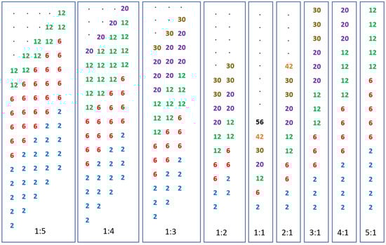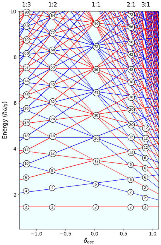 This sequence is that found for the spherical solutions; 1:1 is found to be repeated at each deformation of the system with a slightly different set of systematics either side of sphericity. For n:1 prolate deformations, the sequence of numbers is stacked such that all of the 2s appear first, then the 6s, etc., …, whereas on the oblate side at a deformation of 1:n, the sequences linked to the prolate n:1 deformations are repeated n times. There is thus an underlying symmetry that can be traced back to the spherical harmonic oscillator.