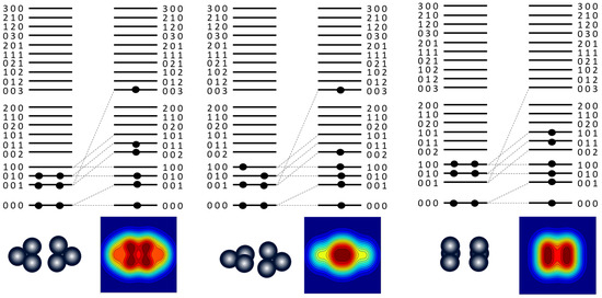Another thing to note is that for different orientations, the circles that represent 2p+2n (α-particle) combinations, are promoted to orbits of different energies associated with the different orientations. In other words, the potential energy associated with different orientations is different, with that of the more compact structure being lowest and the planar structure being the highest (the α +