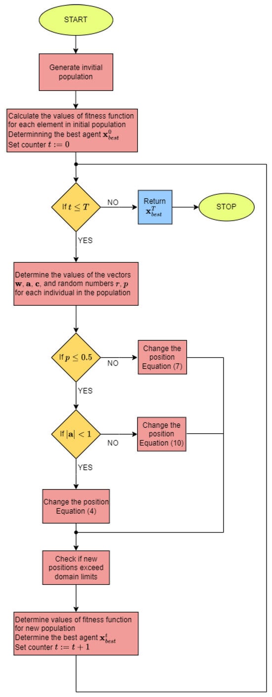 Algorithm 1 presents the following steps of the WOA algorithm. Details about the described algorithm, as well as its application to selected problems, can be found in the articles [,,].