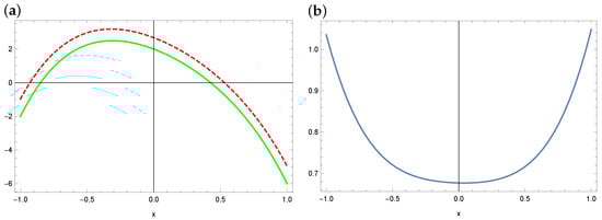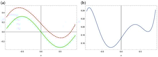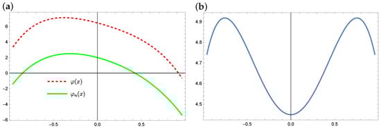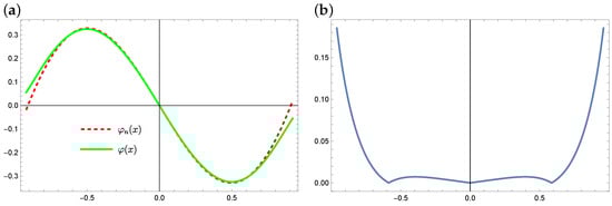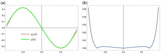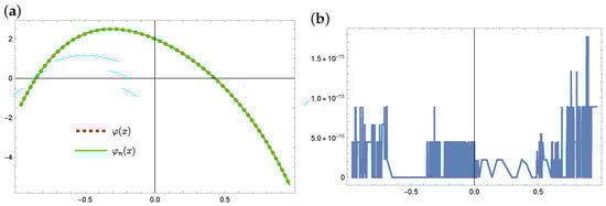 Equation (1) with appropriate assumptions has a solution; however, apart from the null solution (), the analytical form of such a solution is not known in general. There are some analytical methods for solving the Equation (1) (see, e.g., [,,]), but in many cases they are general because they can only be used in certain specific cases of the form of the Equation (1). There are also known numerical methods that can be used to solve the Equation (1) or equations with forms similar to it. These include the following: a projection method or the Galerkin method using the orthogonal basis of Legendre polynomials or using the Taylor series, Bernstein polynomial (see, e.g., [,,,,,,]). However, these methods also have their drawbacks and limitations.