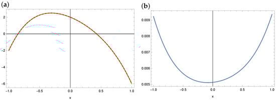 First, the Taylor series method was used to solve the equation. The plots of the exact solution and the approximate solution and the errors of these approximations are provided in Figure 7 (for ) and Figure 8 (for ). As we can see, only for , the errors of the obtained solution are minimal, approximately . In the case of , the approximate solution maintains properties of the exact solution, but the differences between the two functions are significant.