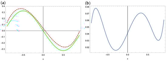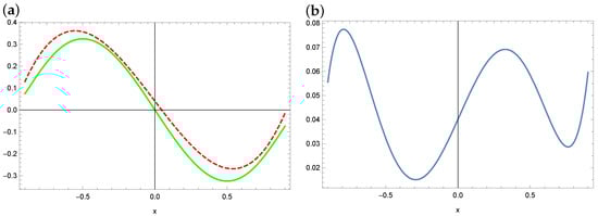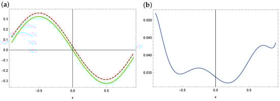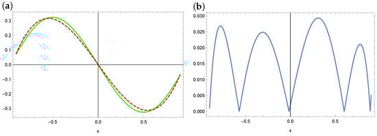 The exact solution (solid green line) and approximate solution (dashed red line) for (a) and the absolute errors of this approximation (b) (example 3).