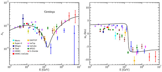 The energy dependences of the amplitude (left) and phase (right) of anisotropy with the contribution from Geminga SNR source. The data points are taken from Marco [75], Super-Kamiokande [24], EAS-TOP [34,76], Milagro [26], IceCube [27,29,31], Ice-Top [30], ARGO-YBJ [33], Tibet [22,23,77], KASCADE-Grande [35,36] HAWC [41], and HAWC-IceCube [41].