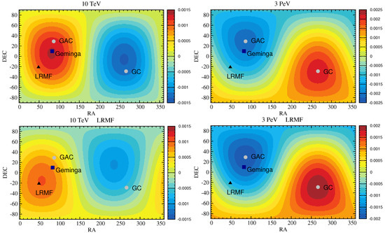 Unlike the energy spectrum, LRMFs clearly deflect CR particles and affect the anisotropy within the concerned energy region, so the LRMF must be considered in the calculation of anisotropy. The parameters of the parallel diffusion coefficient are set as those in Section 2.1. After conducting numerous trial studies on the diffusion coefficient, we set , and the difference between and is 0.32, which, due to the CRs from the TeV to PeV energy region are thought to travel faster parallel to the magnetic field than perpendicular to it [40].