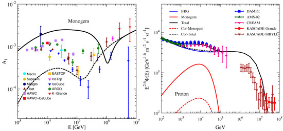 The solid black line in Figure 5 (left) shows the amplitude of anisotropy with the contribution from the Monogem SNR source. We found that the amplitude is greater than the experimental value. It is known that the spin-down energy of the Monogem pulsar is much lower than that of the Geminga pulsar with the value of erg, which suggests the injection power of the Monogem SNR is about one-tenth that of the Geminga SNR. Additionally, the gamma emission of the Monogem SNR is lower than that of the Geminga SNR, which also indicates that the injection power of the Monogem SNR is lower [60]. Therefore, we correct the injection power of Monogem according to the spin-down energy of pulsars. The dashed black line in Figure 5 (left) indicates the corrected amplitude of anisotropy, which is lower than the experimental observation. We calculated the corrected proton spectrum again, as shown by the dashed line in Figure 5 (right). The corrected proton spectrum cannot explain the spectrum hardening at 200 GeV. Therefore, after considering the correction, the contribution of the Monogem SNR to energy spectra and anisotropy can be ignored.
