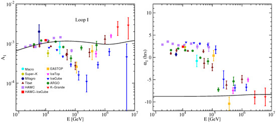 Figure 6 shows the anisotropy with the contribution from the Loop I SNR source. It is clear that neither the amplitude nor phase agree with the measurements of the experiment. The Loop I source, located in the direction of the GC, is in the same direction as the background sources. So, their amplitude of synthesis increases as the energy increases; meanwhile, the phase always points toward the GC.