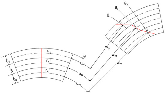 Kinematic relations of the ith layer of the beam structure for cylindrical coordinates can be expressed by the Von Karman nonlinear theory for large displacements for , where superscript represents the layer number.