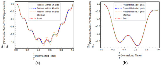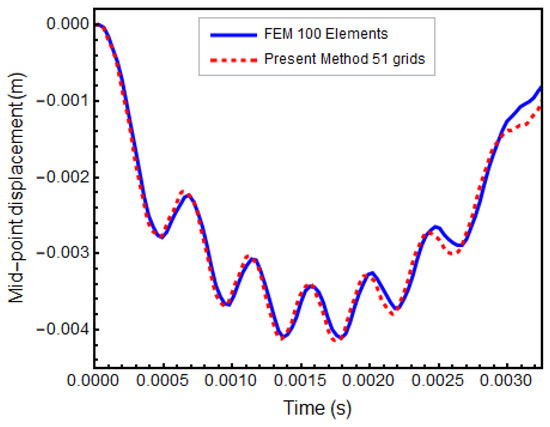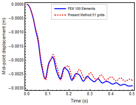 Now we consider Example 1 by adding geometrical nonlinearities. The results are compared with the explicit FEM analyses performed by ANSYS. In GDQM analysis, 51 grid points are used, and a forced vibration response is obtained. Equivalent mass damping with is used to simulate viscoelastic behavior. However, normalization of time and displacement is not made in this case. The time history of the beam center is observed again. As can be seen in Figure 4, a good agreement is observed.