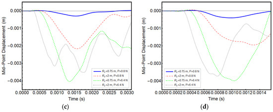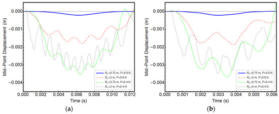 Increasing displacement is expected with increasing radius of curvature, i.e., the straighter the beam, the larger the displacement in linear analyses. However, this is not observed for all cases considered, as seen in Figure 8, due to the nonlinear effects. Moreover, with decreasing curvature and increasing load amplitude, the frequency of oscillations increases in all cases. Beams recover to the undeformed position when the load exits the beams, only in some cases. It is predicted that the load travel frequency does not match the natural frequency of the beam.