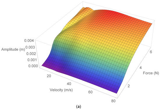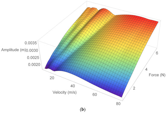 From Figure 9a,b, it can be clearly seen that the displacement of the beam center first increases with the increasing value of the load velocity, then decreases. On the other hand, displacements increase with the load amplitude, as expected. It can be said that there is a nonlinear relationship between the displacement, velocity, and load amplitude.