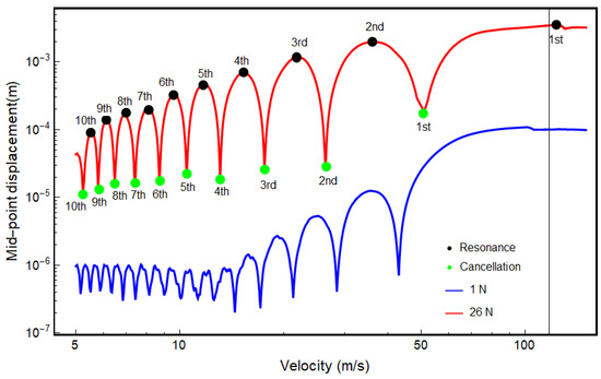 Figure 10 shows the variation of maximum mid-point displacement with load amplitude and velocity after the load leaves the beam. It is observed that for loads with relatively lower amplitude, both the cancellation and resonance velocity values decrease with the increasing load. In contrast, the resonance and cancellation velocity values increase with increasing load for the loads with relatively higher amplitude. It can be said that the ratio of load effect frequency to structural natural frequency is not the only parameter that determines the cancellation and resonance phenomena but also the amplitude of the load. This result can be supported by the effect of force amplitude on nonlinear frequency response functions due to geometrical nonlinear effects, which can be found in the literature. The displacements for minimum and maximum load cases, i.e., 1 N and 26 N, respectively, are presented in Figure 11 for a closer inspection.