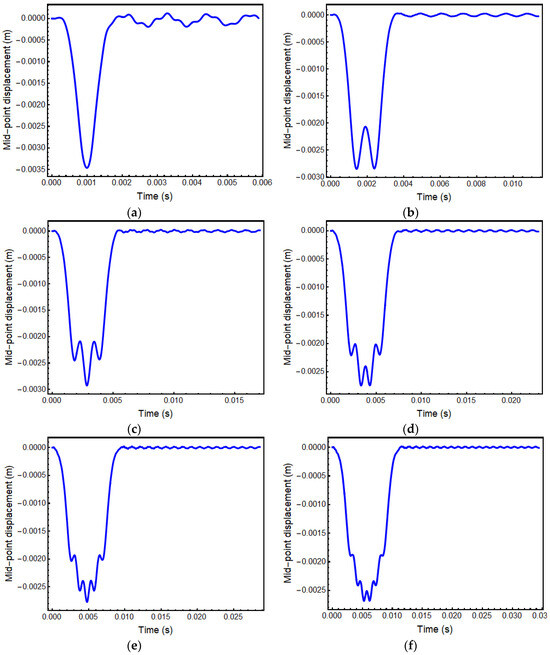 Time histories of the beam mid-point under load with a 26 N amplitude where cancellation and responance are observed are also presented in Figure 12 and Figure 13, respectively. Time history variation with the first, second, third, fourth, fifth, and sixth cancellation velocity values in Figure 11 corresponds to Figure 12a–f, respectively. Furthermore, as seen in Figure 12, there are n number of oscillations during forced vibration in which the time history is symmetrical, which corresponds to the nth value of cancellation velocity. The travel time of the load from one end to the other is one-third of the total analysis time; hence, the free vibration duration is twice as long as the forced vibration duration. However, instead of a complete cancellation, residual responses are observed, as in [14]. Another interesting point is that in the free vibration zone, higher modes are observed with increasing cancellation velocity values, as Figure 12 shows. Time history variation with the first, second, third, fourth, and fifth resonance velocity values in Figure 11 corresponds to Figure 13a–e, respectively. It can be seen that higher modes are not observed for all resonance velocity values.