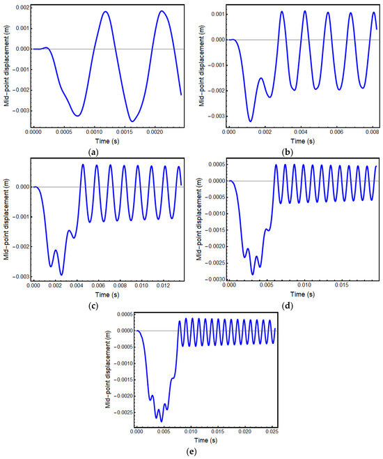 Time history of mid-point displacement under 26 N: (a) 123.4 m/s, (b) 36.5 m/s, (c) 22 m/s, (d) 15.36 m/s, and (e) 11.76 m/s.