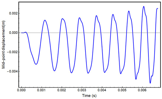 However, when the beam is excitated by eight moving loads with a 26 N load amplitude and a distance of the beam length between all eight loads, the time history of the mid-point displacement is shown in Figure 14. Resonance phenomena are observed at 118.4 m/s velocity, which does not coincide with the resonance condition for a single moving load. The resonance velocity for the forced vibration response for eight consecutive moving loads is represented by a vertical line in Figure 11 that does not coincide with the resonance velocity of the free vibration response of a single moving load. This is possibly due to the nonlinear effects associated with the large strain analyses of the structure.