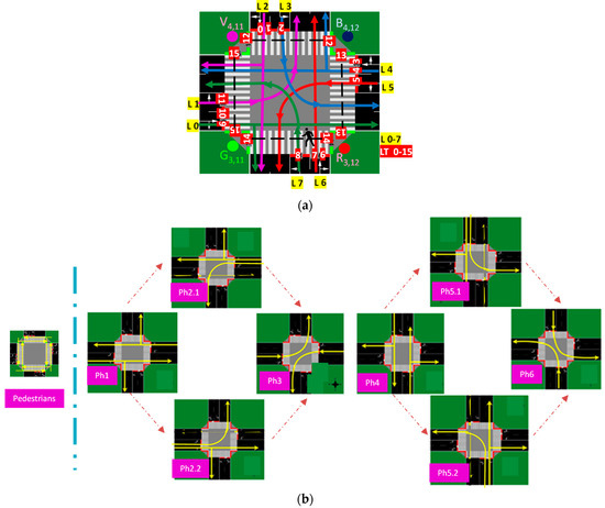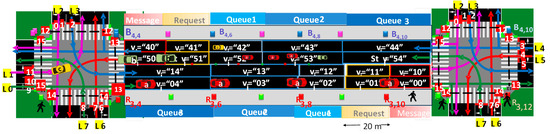 In Figure 3a, the intersection drafts with the possible vehicles (color arrows) and pedestrians (dotted lines) trajectories, coded lanes (L 0–7), and traffic signals (TL 015) are displayed. In Figure 3b, a visual representation unfolds, elucidating the sequential progression of phases within the intersections. This orchestrated flow adheres to a structured cycle length comprising an exclusive pedestrian phase and eight distinct vehicular phases divided into two blocks whose order depends on the dynamic traffic flow. Each of these phases is further intricately subdivided into discrete time sequences or states, delineating a comprehensive temporal framework for the intersection’s operation [28].