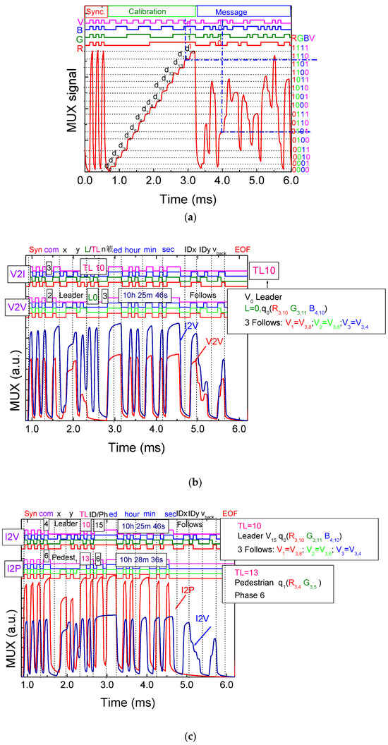 Taking into account Figure 2 and Figure 3 and to illustrate the communication protocol (Table 1) and the technique for decoding calibrated signals emitted by transmitters, Figure 4b displays the decoded optical signals (at the top of the figures) and the signals received (MUX) by the receivers in a V2V (code 2) and V2I (code 3) communication scenario involving a leader vehicle ao at position (R3,10,G3,11,B4,10). This vehicle is communicating with the agent at the second intersection on lane L0 (direction E) at 10:25:46 and is followed by three other vehicles, V1, V2, and V3, with the same direction, located at positions, R3,8, G3,6, and R3,4, respectively.