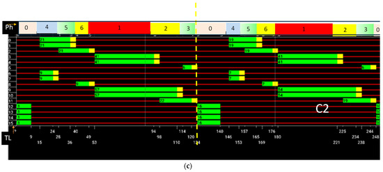 The traffic light diagram (Figure 6) typically illustrates the arrangement of the traffic lights (red, green, or yellow) along a cycle at an intersection and their corresponding signal phases (red, yellow, green). They serve as a visual aid for understanding how traffic signals control the flow of vehicles through an intersection, helping to optimize signal timing, reduce congestion, and improve overall traffic safety. Along a cycle, the traffic lights are depicted horizontally as colored lines or boxes. The colors of the traffic lights indicate the current signal phase for each traffic light (TL:0–15, at the left hand), with red, yellow, and green lights representing stop (red lines), prepare to stop (yellow boxes), and go (green boxes), respectively. To illustrate the sequence of signal phases, lines are drawn between the traffic lights, indicating the progression of the signal cycle. They show that when one set of lights turns green, another set turns red to facilitate the safe movement of traffic through the intersection. Figure 6a,c display the phase diagrams for the two connected intersections, C1 and C2, during two cycles of 120 s. Figure 6b provides an overview of the SUMO environment during a simulation with high pedestrian and medium vehicle traffic flows. As can be observed in the diagrams, it is possible to distinguish the different cycles that occur during the simulation. It always begins with a pedestrian phase, during which some individuals have the opportunity to cross the crosswalk, turning red for pedestrians starting from 11 s. Then, phases dedicated to vehicles take place until it concludes at 123 s. At this moment, the second cycle begins, with the pedestrian phase becoming active again. The same process repeats until 247 s, marking the end of this second cycle and the initiation of a third cycle. These diagrams align with the analysis conducted for pedestrians that follows.