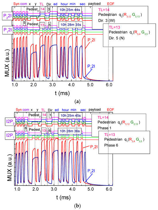 Figure 7a illustrates the MUX signal sent to the traffic lights (TL’s) by pedestrians to cross both intersections (C1 and C2) while waiting in the corners (P1,22I). In this figure, the top part displays the decoded messages, and on the right-hand side, the content of the message is outlined. Furthermore, Figure 7b demonstrates the MUX signal received by the traffic lights (I2P1,2). The top part of the figure showcases the decoded messages, while the right-hand side provides a draft of the message content. This visual representation helps to understand the communication between pedestrians waiting in the corners and the corresponding traffic lights, providing insights into the signals exchanged for pedestrian crossings at both intersections (C1 and C2).