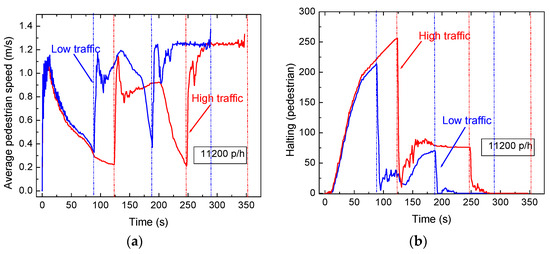 Figure 8a illustrates the comparisons between the average speeds of pedestrians in two scenarios with the highest and lowest traffic flow and 160 m target road length. In the high-traffic scenario, it was considered a flow of 2300 vehicles/hour and 11,200 pedestrians per hour. In the low-traffic scenario, the number of vehicles decreases to 1800 per hour while the pedestrian flow remains constant. In Figure 8b, the same comparison is made for the halting.
