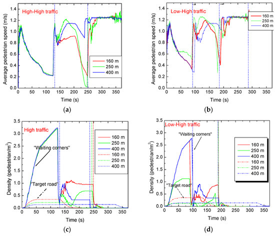 In Figure 9a, the average speeds of pedestrians are compared in a high-traffic scenario with 2300 vehicles/hour and 11,200 pedestrians per hour for the three roads length (High-High). In Figure 9b, the number of vehicles decreases to 1800 per hour while the pedestrian flow remains constant (Low-High). Figure 9c,d represent the pedestrian densities in the “waiting corners” and on the “target road”, respectively, for the same scenarios.