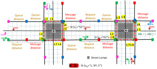 The simulated scenario is multi-intersections, as displayed in Figure 2, based on two 4-way intersections, each with two lanes on each arm, approaching the intersection from compass directions, leaving two lanes on each arm. Each arm is 100 m long. On every arm, each lane defines the possible directions that a vehicle can follow: the right lane enables vehicles to turn right or go straight, while on the left lane, the left turn is the only direction allowed. In the center of the intersection, a traffic light system controlled by the IM (also known as the agent) manages the approaching traffic. Emitters (streetlamps) are located along the roadside.