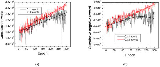 In Figure 11, the cumulative negative reward across successive episodes are presented for both intersections, denoted as C1 and C2 in a 160 m (1 × 2) topology. The states used for training were obtained either by a single agent situated in C1 or C2 or by two agents, with one in C1 and the other in C2. This configuration suggests that the RL model was evaluated and trained under different scenarios, including the use of a single agent for each intersection and the coordination of two agents, each responsible for one of the intersections (C1 and C2).