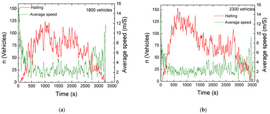 Comparison of average speed and halting in both scenarios: (a) 1800 vehicles/hour; (b) 2300 vehicles vehicles/hour.