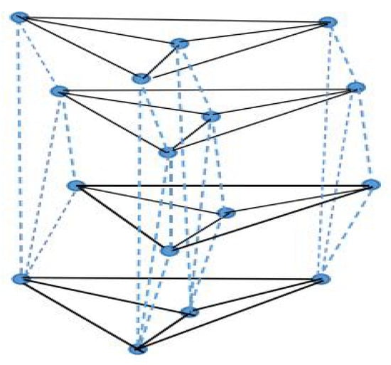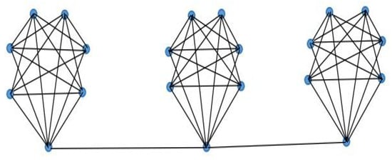 The network structure in this subsection is described as follows. From a vertical view, the counterpart nodes with a higher degree of different layers are designed to form the fan graph, and the coronary substructure is a balanced complete k-partite graph. The graph is characterized by and abbreviated as , where the definition of is the same as that of Section 3.2, and means the multipartite substructure being acted on has a partition of vertex set and each part has m vertices. The related noisy network is denoted by . Figure 4 gives an example of the coronary substructures placed on each node of .