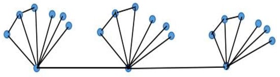 In this subsection, a class of lattice-like star-fan composed network is designed. The vertices in the peripheral subgraph are required to be disconnected with other layers. The layered lattice-like structure is defined by and abbreviated as , where denote the number of vertices in the wheel and fan graph of the lattice-like central structure (see Figure 1), and the corresponding noisy network is denoted as . Figure 3 gives an example to show the partial coronary substructure, i.e., . It is designed to form a fan graph copy during the graph operation, and the other part of the peripheral substructure is designed to be a star graph copy.