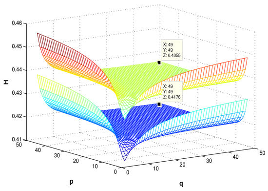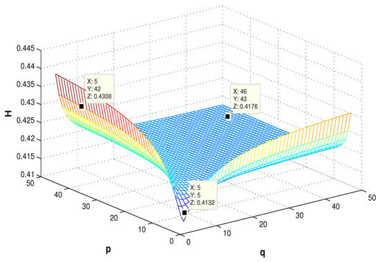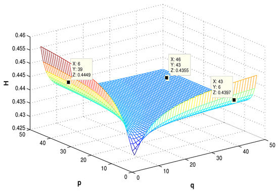 When p and q both tend to infinity, (see the point (46,43,0.4176)). This coincides with the calculation results of Section 3.1.