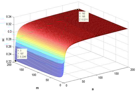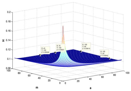 Figure 7 describes the change surface of with the parameters p and q when . It implies that the point (46,43,0.4355) is in accordance with the tendency as , and similar results to Figure 6 can be acquired. In Figure 8, the comparison of and with the change in p and q is given. From the point (49,49,0.4355) and (49,49,0.4176), we can see that the difference of the two function values is equal to 0.0179, which is consistent with the result (3) on page 6. Figure 9 shows the variance of with the change in a and m. Through Figure 9, we can see that when are both relatively small, is larger than that in the case where at least one of is relatively large. The two pair of points (45, 100, 0.09928), (70, 100, 0.09921) and (100, 85, 0.09919), (100, 28, 0.09942) imply that when a or m tends to infinity, will decrease monotonously to the constant 0.099, and the value is only relevant to p and q, which is consistent with Remark 3. Figure 10 shows the changing curve of with a and m, . Compared with Figure 9 and Figure 10, and combined with the result in Section 3.4, we find that when are fixed to the same value for and , the inequality always holds. When m, p, q are fixed, the coherence will increase monotonously to a constant.