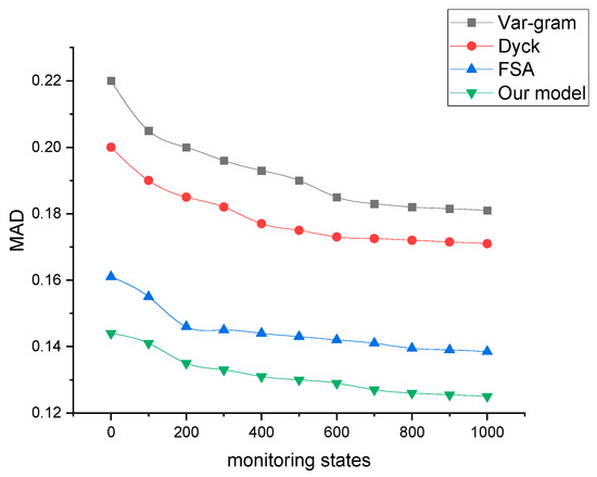 According to the results, it can be seen that when the number of state detection points s is small, the MAD value of our model is significantly better than the other three models. For example, when s = 20, the MAD value of our model is 10.49% lower than that of the FSA model. When s > 300, the curve of our model is relatively flat, with MAD values tending towards 0.125 and consistently lower than FSA’s 0.14, indicating that our model has better accuracy. When s > 600, the two curves of our model and the FSA model gradually approach, indicating that when the obtained program behavior states reach a certain number, the performance of the model tends to stabilize.