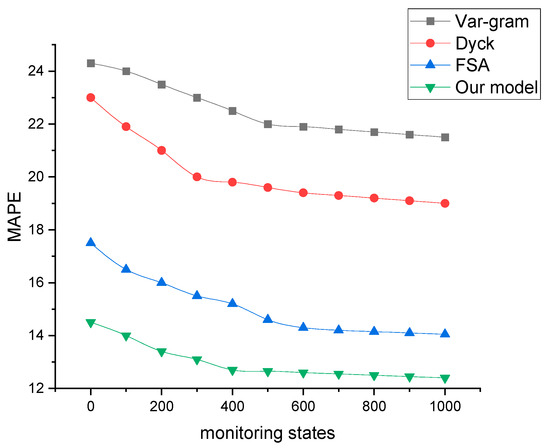 Similarly, s states were selected from 1000 states to collect information from the model, with 20 ≤ s ≤ 1100. A total of 20 calculations were conducted to verify the unbiased nature of the model. The Var gram model, FSA model, and Dyck model were compared. The experimental results of the MAPE comparison under different monitoring states are shown in Figure 6.