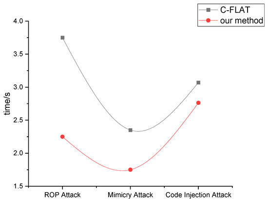 This experiment uses the sample database VX Heaven [30] to compare the detection of three types of attacks, namely, ROP attack, mimicry attack, and code injection attack, by both our system and the C-FLAT method, and records the time when the two methods detect the attacks separately. This paper downloads various types of malicious software samples from the sample library, modifies some code according to the attack method, and compiles and runs the malicious code for testing. A ROP attack constructs ROP attack code in the sample using techniques such as memory overlay and pointer replacement. A mimicry attack involves adding or replacing instruction parameters and exchanging instruction order in the code instruction sequence. A code injection attack changes conditional judgments, loop structures, or jump statements in the code.