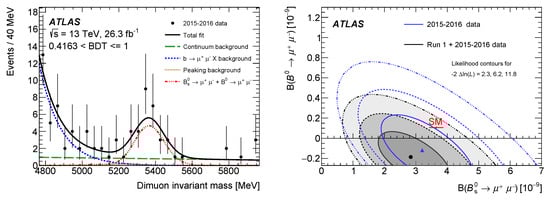 - ATLAS Collaboration. Study of the rare decays of and B0 mesons into muon pairs using data collected during 2015 and 2016 with the ATLAS detector. J. High Energy Phys. 2019, 4, 098. [Google Scholar] [CrossRef]